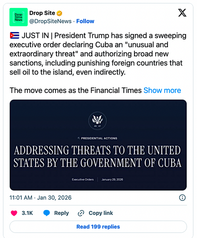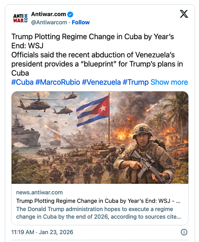 It’s just incredible how quickly and aggressively the U.S. is advancing long-standing agendas of global conquest under the Trump administration. Now they’re racing to take out Cuba.