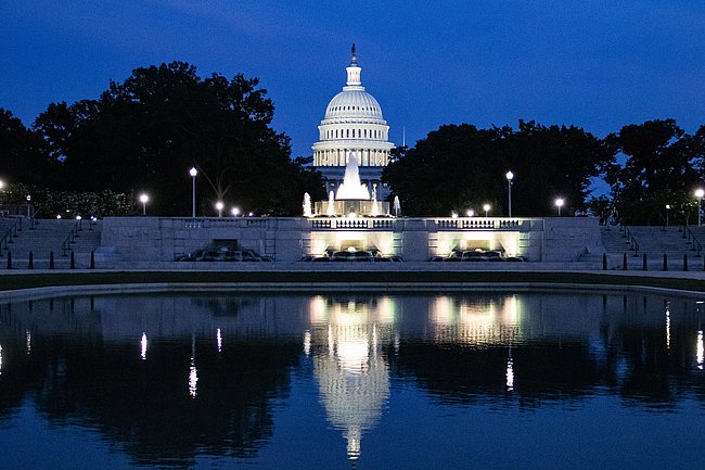 The U.S. Capitol at night.
