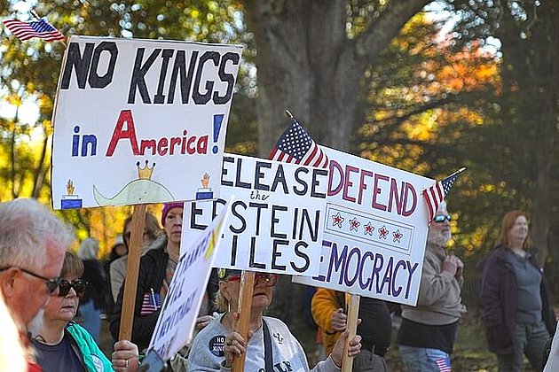 Sign demanding release of Epstein files at No Kings Protest, Mass., Oct. 18, 2025.