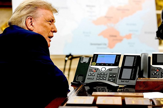President Donald Trump on a phone call with Russian President Vladimir Putin at the White House on Aug. 18, 2025, before the U.S. president met with with Ukraine’s President Volodymyr Zelensky and European and NATO leaders in the Oval Office. (White House/Daniel Torok)