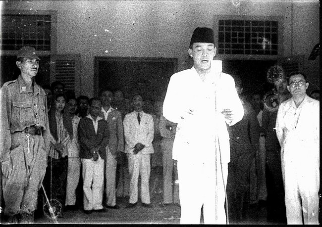 Sukarno, accompanied by Mohammad Hatta, declaring the independence of Indonesia at 10:00 am on Friday, 17 August 1945, in Jakarta.