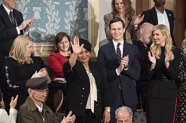 Alice Johnson during Trump’s State of the Union Address in Washington, D.C., on Feb. 5, 2019. Jared Kushner, advisor to the president, and his wife, Ivanka Trump, the president’s eldest daughter, on her right
