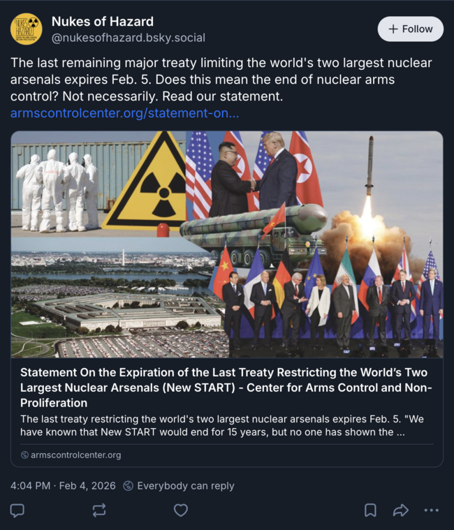 Last week, the Bulletin of the Atomic Scientists’ Science and Security Board advanced its symbolic Doomsday Clock to 85 seconds to midnight, the closest it has ever been to global thermonuclear annihilation, citing developments including failure to extend New START, China’s growing arsenal, and Russian weapons tests — to which Trump has vowed to respond in kind.