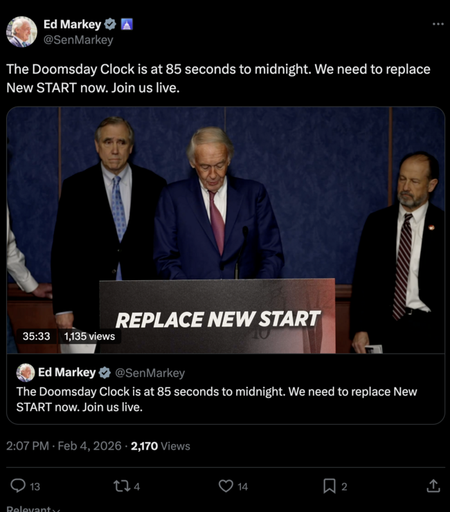 “The Doomsday Clock is at 85 seconds to midnight,” said Markey — who co-chairs the congressional Nuclear Weapons and Arms Control Working Group. “We need to replace New START now.”