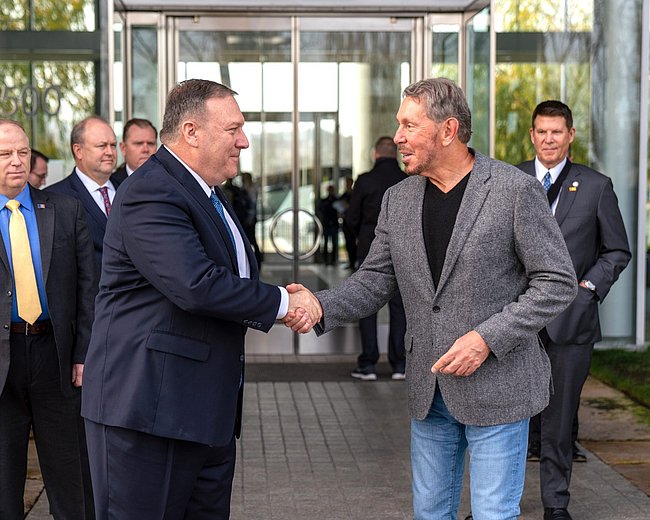 Ellison, on right, with Michael Pompeo during the secretary of state’s meeting with Oracle executives in Redwood City, California, in 2020.