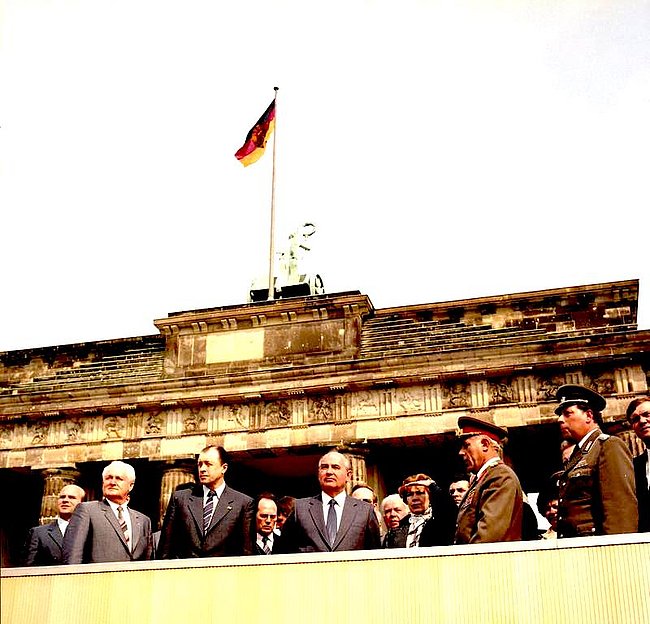 Soviet leader Mikhail Gorbachev at the Brandenburg Gate in 1986 during a visit to East Germany.