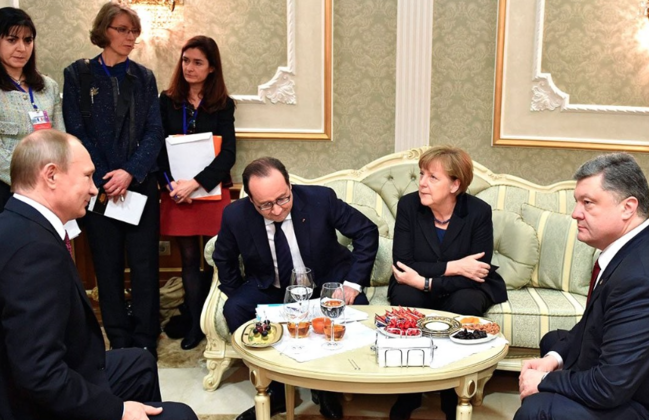Feb. 12, 2015: Russian President Vladimir Putin, French President Francois Hollande, German Chancellor Angela Merkel, Ukrainian President Petro Poroshenko at Normandy format talks in Minsk, Belarus.