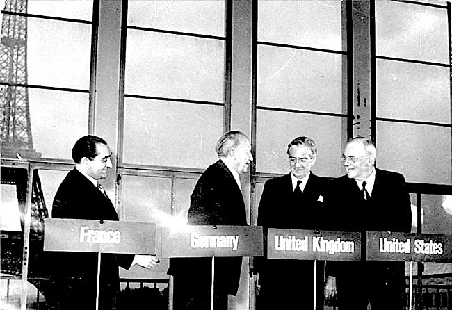 From left: French Prime Minister Pierre Mendes-France, West German Chancellor Konrad Adenauer, British Foreign Minister Anthony Eden and American Foreign Minister John Foster Dulles meet in Paris about the rearmament of West Germany, Oct. 20, 1954.