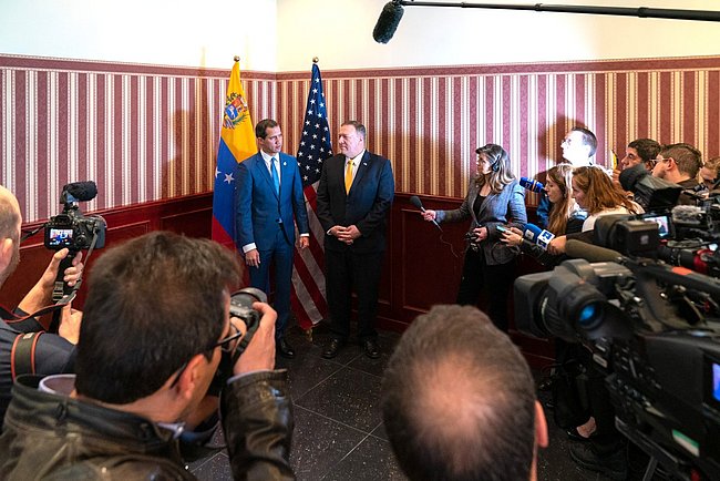 Guiadó and U.S. Secretary of State Mike Pompeo addressing the press in Bogotá, Colombia, in January 2020.