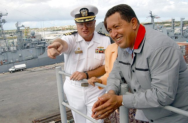 Chávez visiting the USS Yorktown, a U.S. Navy ship docked at Curaçao in the Netherlands Antilles, north of Venezuela in March 2002, a month before the brief coup, during UNITAS, a multi-national naval exercise conducted by U.S., Caribbean, Central, and South American naval forces.